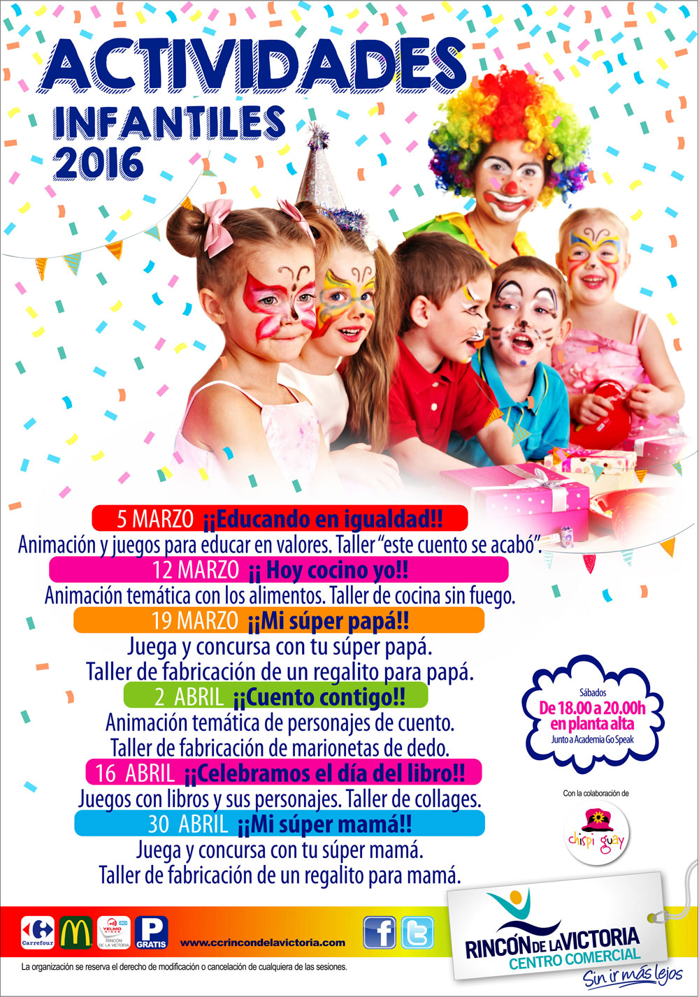 Los sábados de 2016 de 18.00 a 20.00h, están reservados ya en vuestra agenda y la de los peques de la casa con nuestro Calendario de Actividades Infantiles Gratuitas.