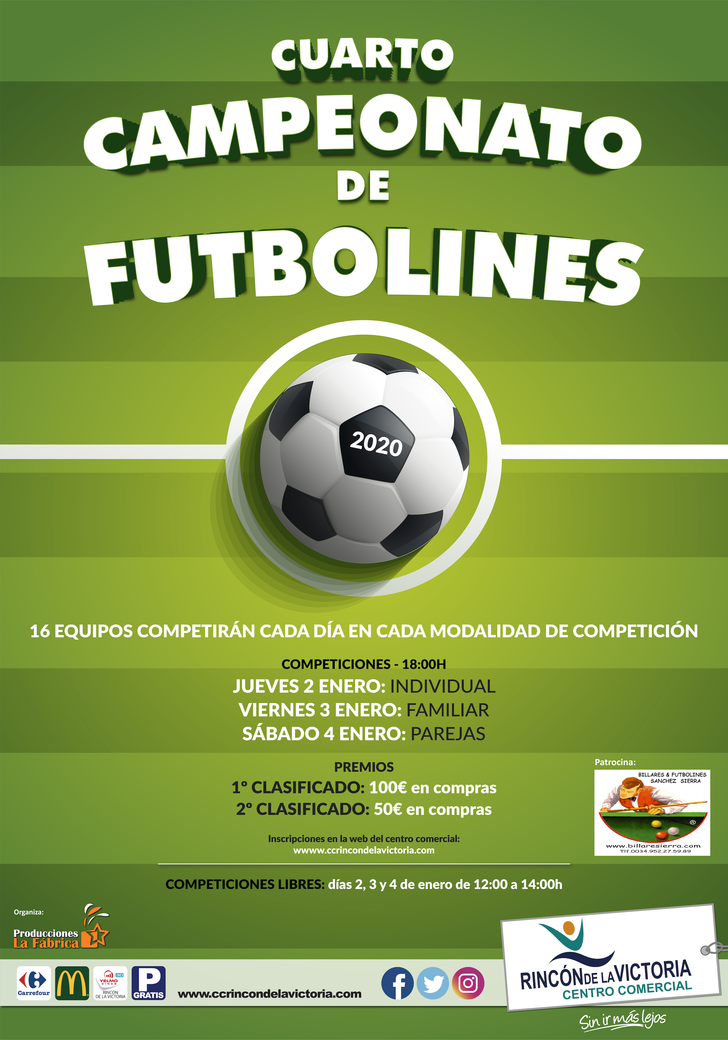 Los días 2, 3 y 4 de enero de 2020 celebramos la cuarta edición del Campeonato de Futbolines Centro Comercial Rincón de la Victoria en el que 16 equipos competirán cada día en las siguientes categorías: