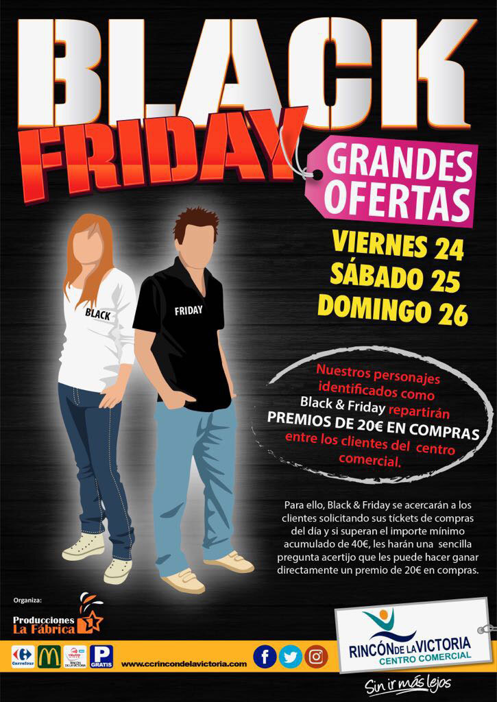 El viernes 24, sábado 25 y domingo 26 de noviembre, Black y Friday visitarán nuestro centro comercial y repartirán 20€ en compras entre nuestros clientes. ¡Si estos dos personajes se acercan a ti, estás de suerte!