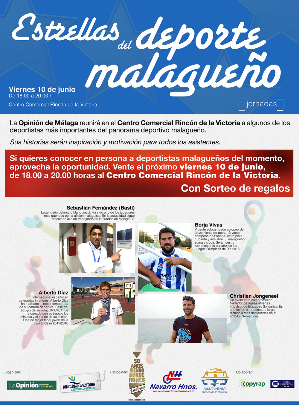 Este viernes 10 de junio, de 18:00 a 20:00 h, La Opinión de Málaga reunirá en el Centro Comercial Rincón de la Victoria a algunos de los deportistas más importantes del panorama deportivo malagueño.