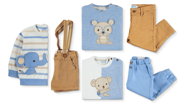 Ven a Mayoral y descubre la colección NEW NOW en la que los tonos tostados y azules actúan como lienzo de diseños dulces y prácticos con motivos de animales.