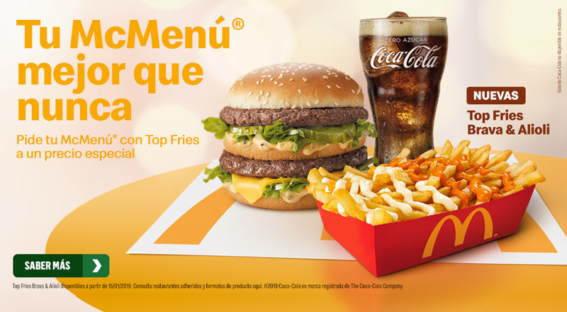 Tu McMenú, ¡mejor que nunca! McMenú + Top Fries con salsa brava y alioli a un precio especial.