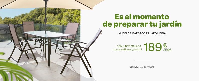 Es el momento de preparar tu jardín para el buen tiempo. Ahora, el conjunto Málaga, formado por una mesa, 4 sillas y un parasol, por solo 189€ (antes, 259€).