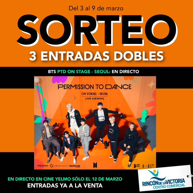 Del 3 al 9 de marzo, a las 12:00h, entra en nuestro Facebook o Instagram y participa en el sorteo de 3 entradas dobles para asistir a la retransmisión en directo del concierto de BTS “Permission to dance On Stage – Seúl”, que tendrá lugar el día 12 de marzo de 2022 a las 9.45h en Cine Yelmo Rincón de la Victoria.