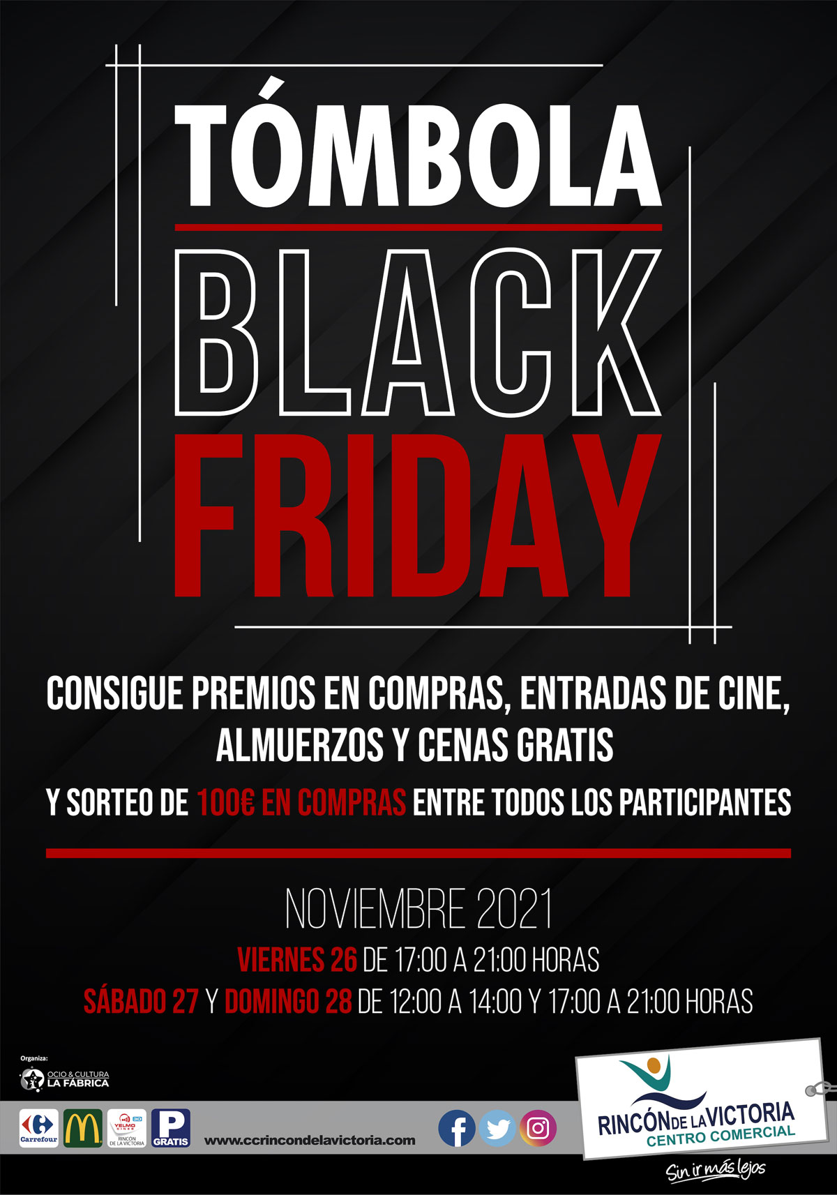 En C.C. Rincón de la Victoria celebramos el Black Friday con una tómbola llena de premios: premios de 50€ y 20€ en compras, entradas de cine, almuerzos y cenas gratis.